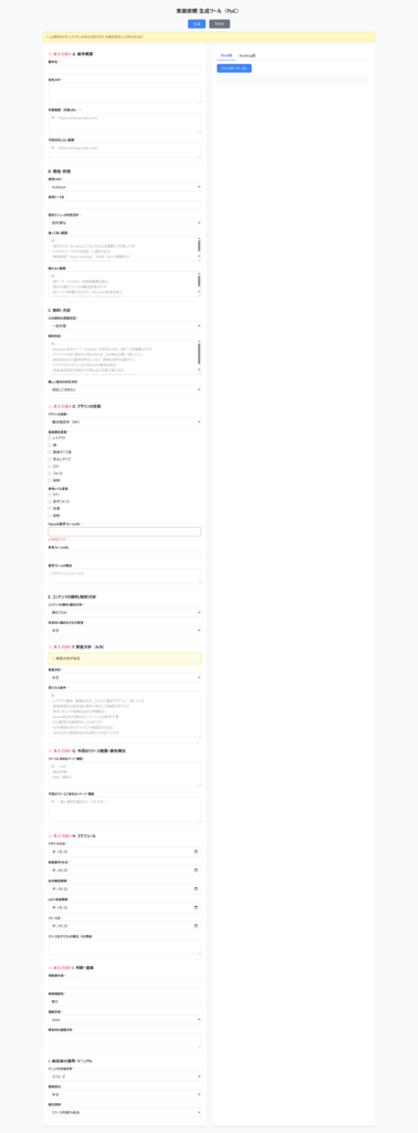 本ツールは、ディレクターから実装者へ依頼を行う際に必要な要件を事前に整理・明文化することを目的として、要件入力 → 実装依頼文の自動生成までを一貫して行える仕組みとして設計・実装したものです。